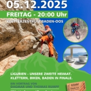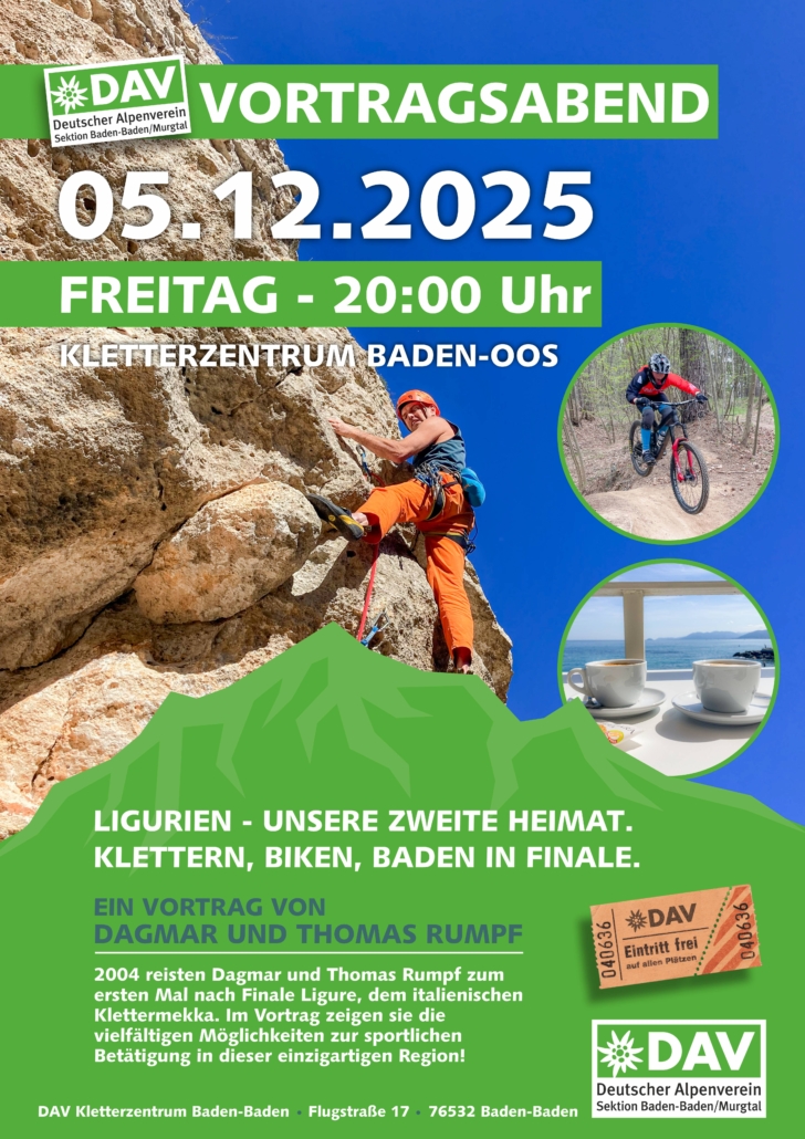 2004 reisten beide zum ersten Mal nach Finale Ligure, dem italienischen Klettermekka. Es folgten unzählige weitere Urlaube, und inzwischen ist ihnen die Region an der Riviera zur zweiten Heimat geworden. ImVortrag zeigen sie die schier unerschöpflichen Möglichkeiten zur sportlichen Betätigung, sei es beim Klettern, beim Biken oder auf Schusters Rappen; sie führen uns aber auch an kristallklare Flüsse, malerische Dörfer und ins beste Café Liguriens.