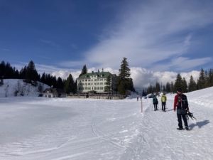 Vom Hüttenwirt und seinem Team wurden wir am Abend und zum Frühstück bestens versorgt, so dass wir am Samstag gut gestärkt und voller Motivation aufbrechen konnten. Durch die kritische Schneesituation der zurückliegenden Tage mit z.T. immer noch sehr großen Wächten an den Graten war der Aufstieg auf den „Spitzmeilen“ und weitere Weg zum Wissmeilenpass zu heikel und wir gingen zunächst den Weg vom Vortag ein Stück zurück, um dann hinter dem „Gross Sächser“ in Richtung „Rainissalts“ aufzusteigen. Für das letzte Stück auf den 2259m hohen Gipfel ließen wir die Rucksäcke an unserem Rastplatz zurück. Nach einer Mittagspause ging es zunächst steil abwärts, vorbei am den beeindruckenden Felsen des „Sächsmoor“ und leicht hoch zum Übergang „Chrüzen“ (1904m). Hier konnten wir bereits unser Tagesziel sehen, das alte Berghotel „Seebenalp“. Wir waren früh dran und sind deshalb zunächst entlang des Grats auf den „Cuncels“ (1938m) auf- und von dort querfeldein und steil zu den Ziehwegen des Skigebiets abgestiegen, wo wir noch einen knappen Kilometer bis zu unserem Übernachtungsplatz vor uns hatten. Wir genossen den Komfort einer warmen Dusche, Kaffee, Kuchen und Getränke auf der Sonnenterrasse und am Abend die besonderen Atmosphäre im Speisesaal des seit Jahrzehnten praktisch unveränderten Hauses.
